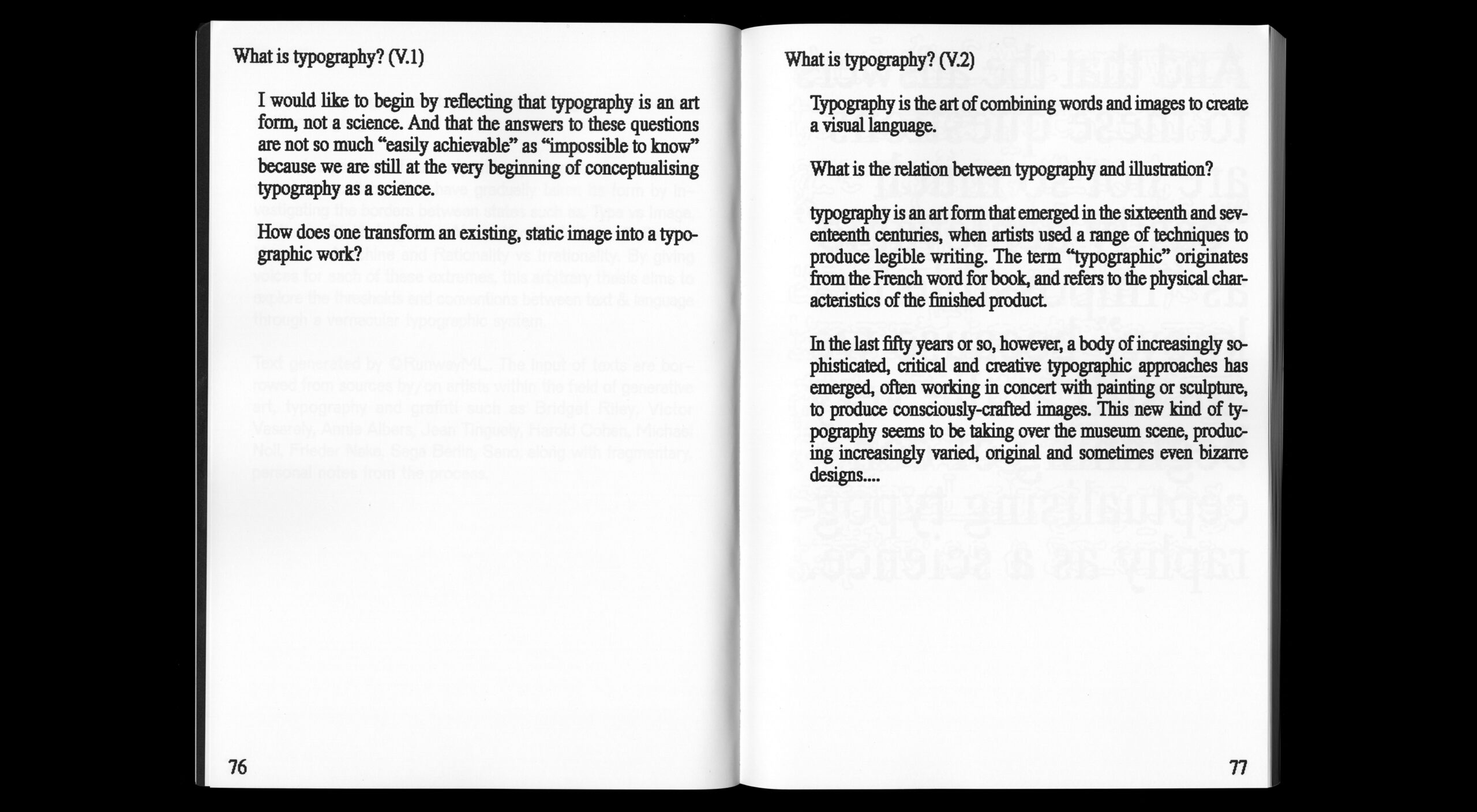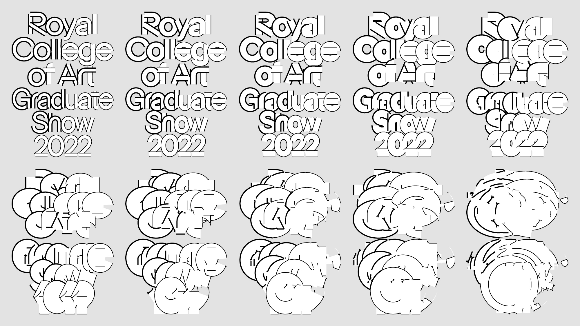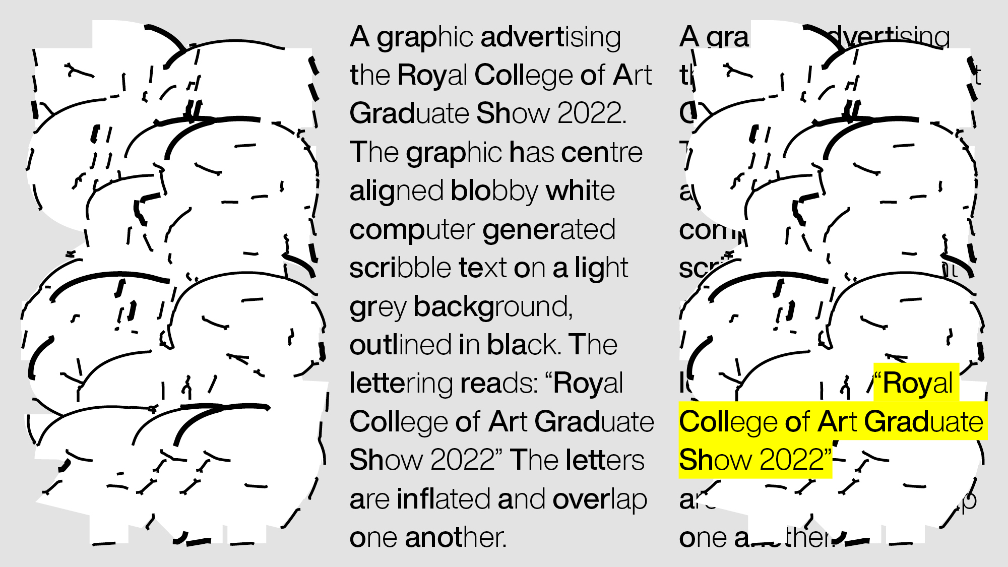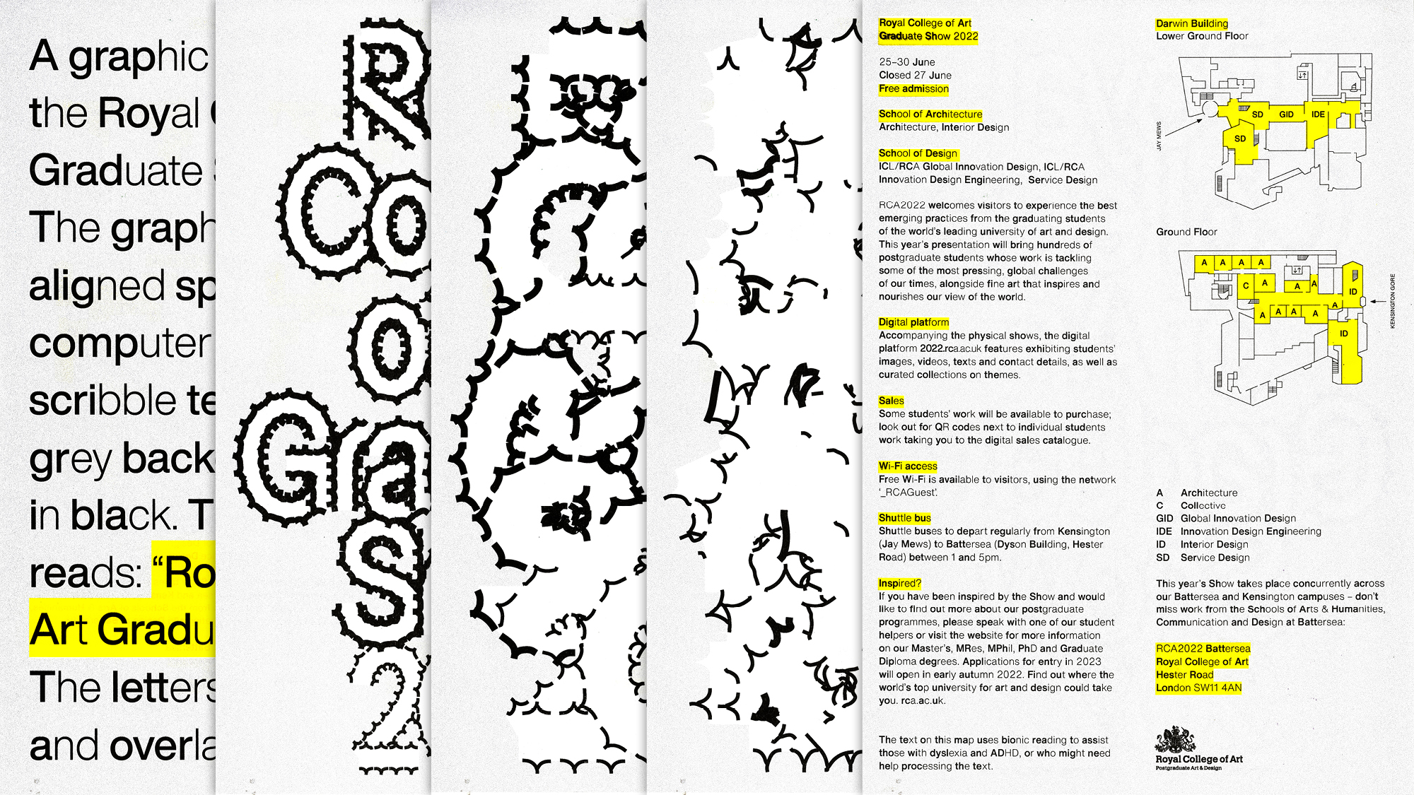 The visual identity for Royal College of Art Graduate Show 2022 presents itself as a generative collaboration with technology as our relationship keep growing towards complete codependency. While this is the surface of the identity, the core concept is accessibility and how design operates as an inclusive and liberatory practice. The identity is a fused layered alt-text version of these kinetic, illegible typographic ‘errors’ which utilise Bionic Reading by Renato Casutt. Read more at RCA2022
